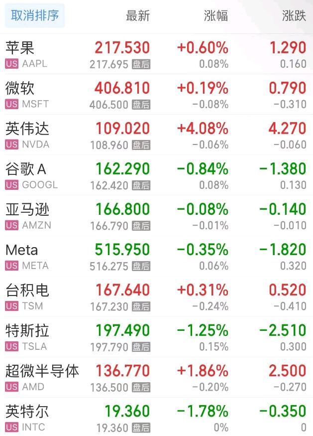 热门美股中,苹果涨0.60%,微软涨0.20%,英伟达涨4.08%,谷歌C跌0.87%,谷歌A跌0.84%,亚马逊跌0.08%,Meta跌0.35%,台积电涨0.31%,特斯拉跌1.26%,超微半导体涨1.86%。
