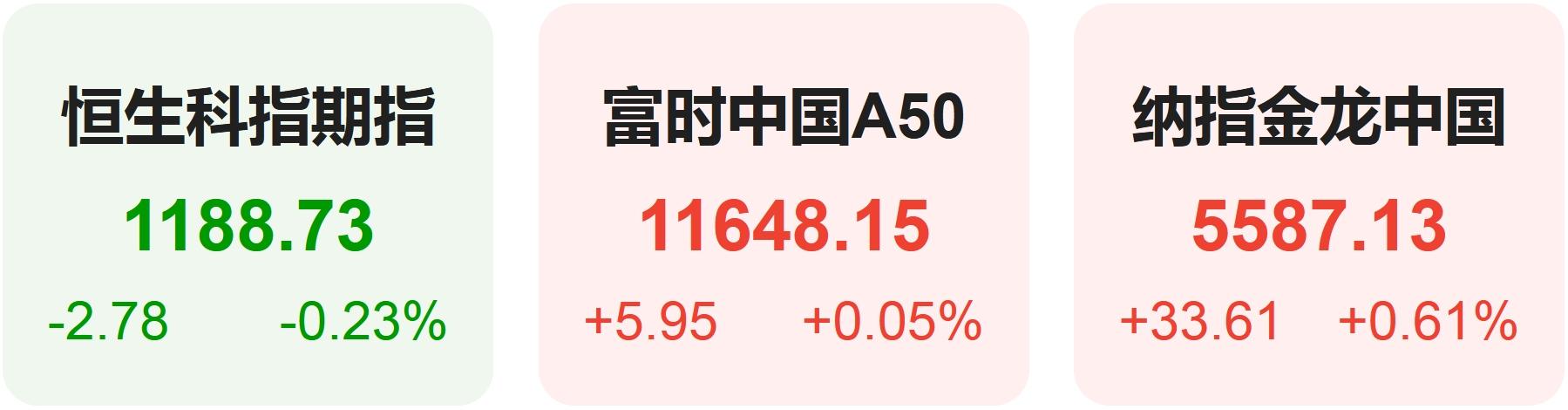 隔夜恒生科技指数期货下跌0.23%,纳斯达克中国金龙指数上涨0.61%,富时中国A50指数上涨0.05%。