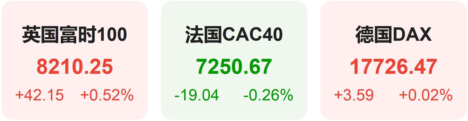 欧洲股市方面,英国富时100指数小幅上涨0.52%,报8210点。法国CAC40指数小幅下跌0.26%,报7251点。德国DAX指数小幅上涨0.02%,报17726点。