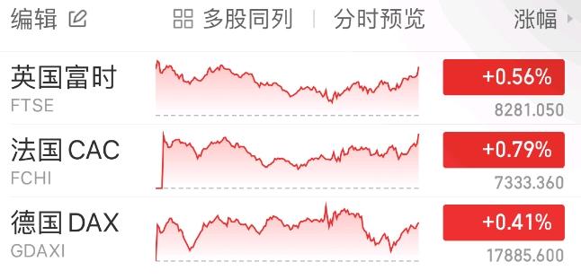 欧洲股市方面,英国富时100指数小幅上涨0.56%,报8281点。法国CAC40指数小幅上涨0.79%,报7333点。德国DAX指数小幅上涨0.41%,报17886点。