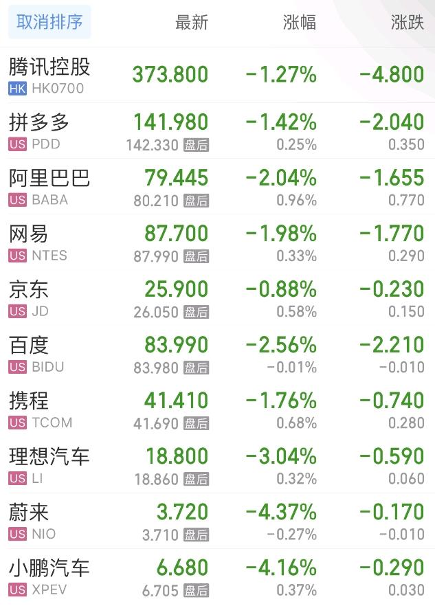 热门中概股方面,腾讯控股(港股)跌1.27%,拼多多跌1.42%,阿里巴巴跌2.04%,网易跌1.98%,百度跌2.56%,携程跌1.76%,理想汽车跌3.04%,蔚来跌4.37%,小鹏汽车跌4.16%。