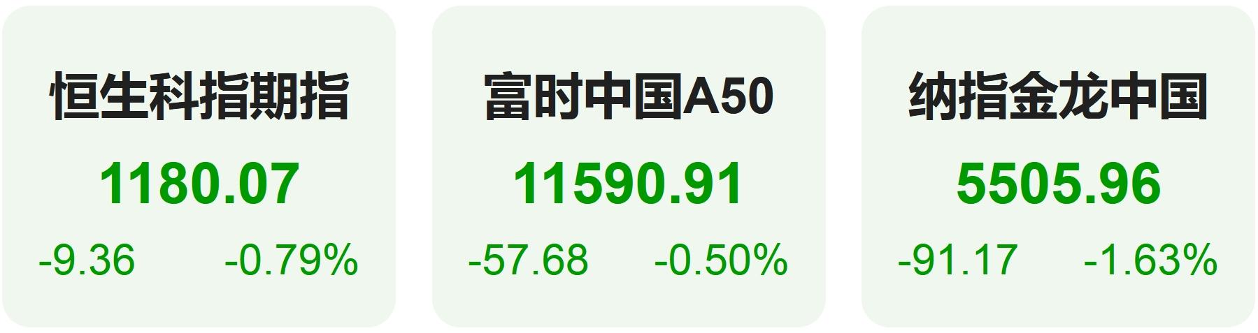 隔夜恒生科技指数期货下跌0.79%,纳斯达克中国金龙指数下跌1.63%,富时中国A50指数下跌0.50%。