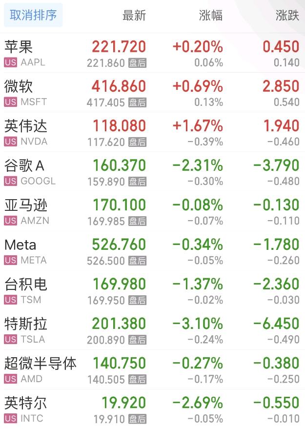热门美股中,苹果涨0.20%,微软涨0.69%,英伟达涨1.67%,谷歌C跌2.35%,谷歌A跌2.31%,亚马逊跌0.08%,Meta跌0.34%,台积电跌1.37%,特斯拉跌3.10%,超微半导体跌0.27%。