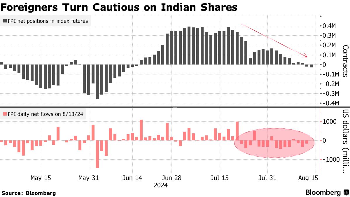而与此同时,外国证券组合投资者(或称FPI)一直在现金股票市场上抛售印度股票。截至8月13日,他们在6月和7月增加了60多亿美元印度股票持仓后,本月已减持近20亿美元的印度股票。