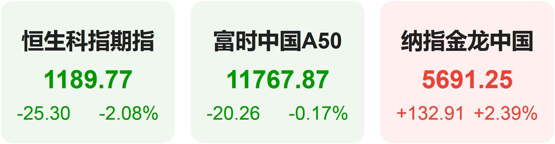 隔夜恒生科技指数期货下跌2.08%,纳斯达克中国金龙指数上涨2.39%,富时中国A50指数下跌0.17%。