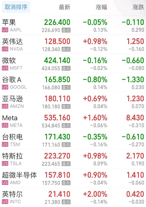 热门美股中,苹果跌0.05%,英伟达涨0.98%,微软跌0.16%,谷歌C跌0.79%,谷歌A跌0.80%,亚马逊涨0.69%,Meta涨1.60%,台积电跌0.36%,特斯拉涨0.98%,超微半导体涨0.90%。