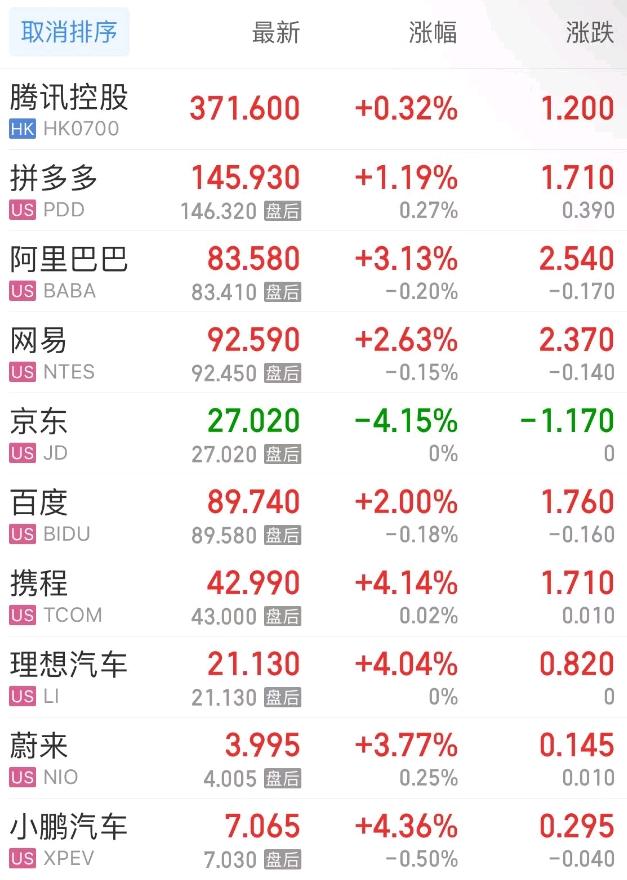热门中概股方面,腾讯控股(港股)涨0.32%,拼多多涨1.19%,阿里巴巴涨3.13%,网易涨2.63%,百度涨2.00%,携程涨4.14%,理想汽车涨4.04%,蔚来涨3.77%,小鹏汽车涨4.36%。