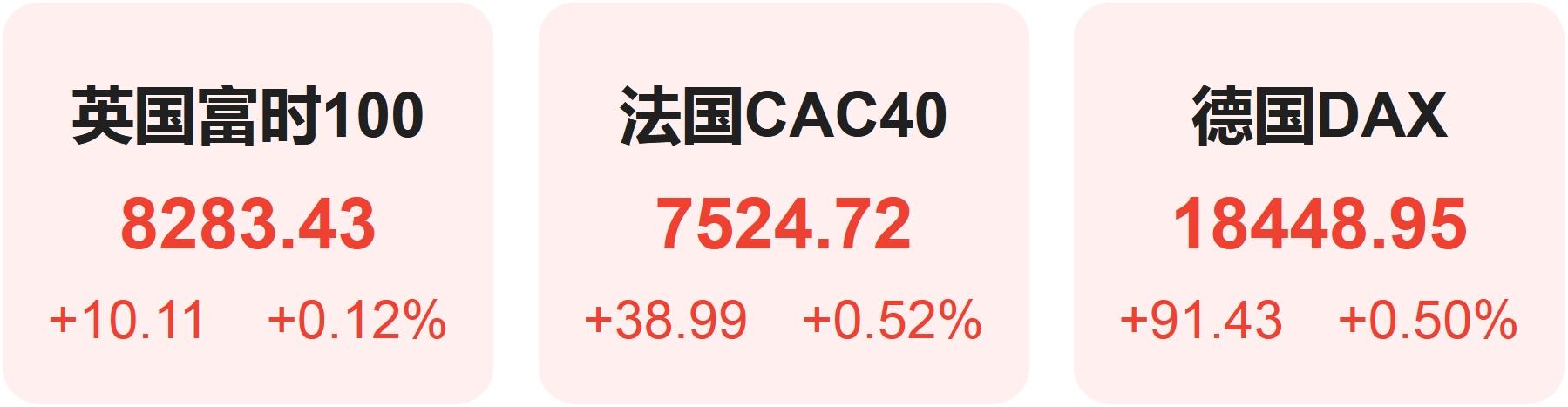 欧洲股市方面,英国富时100指数小幅上涨0.12%,报8283点。法国CAC40指数小幅上涨0.52%,报7525点。德国DAX指数小幅上涨0.50%,报18449点。