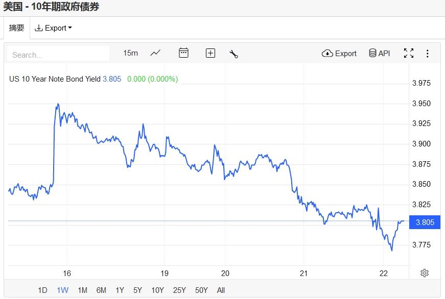 美债收益率延续跌势,基准的10年期美债收益率收报3.805%;对货币政策更敏感的两年期美债收益率最终收报3.943%。