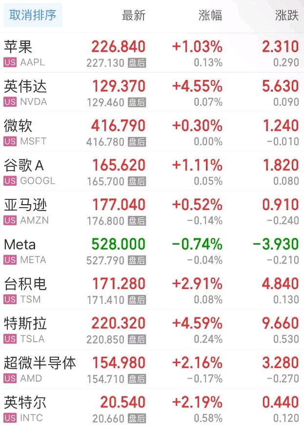 上周五热门美股中,苹果涨1.03%,英伟达涨4.55%,微软涨0.30%,谷歌C涨1.17%,谷歌A涨1.11%,亚马逊涨0.52%,Meta跌0.74%,台积电涨2.91%,特斯拉涨4.59%,超微半导体涨2.16%。