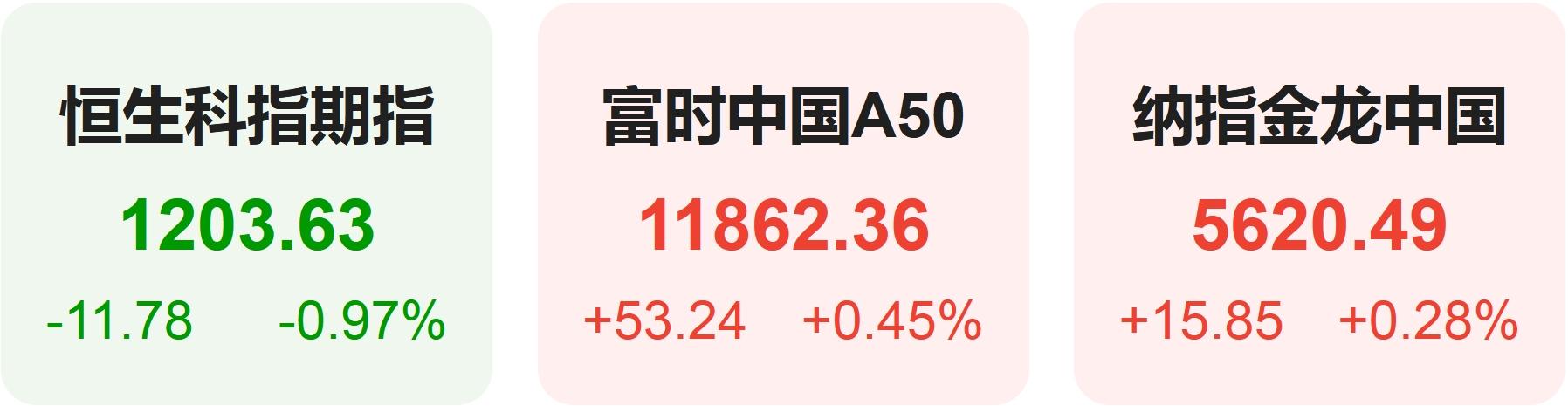 上周五,恒生科技指数期货下跌0.97%,纳斯达克中国金龙指数上涨0.28%,富时中国A50指数上涨0.45%。
