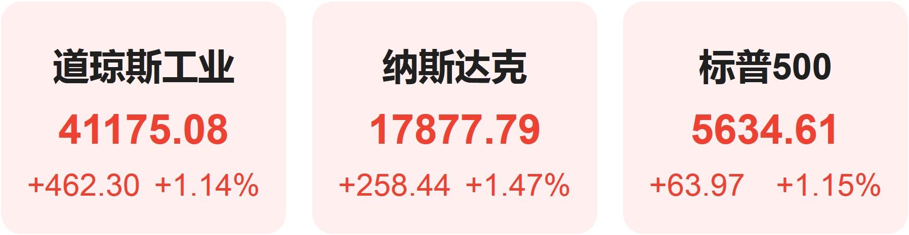 截至上周五收盘,道指涨462.30点,涨幅为1.14%,报41175.08点;纳指涨258.44点,涨幅为1.47%,报17877.79点;标普500指数涨63.97点,涨幅为1.15%,报5634.61点。