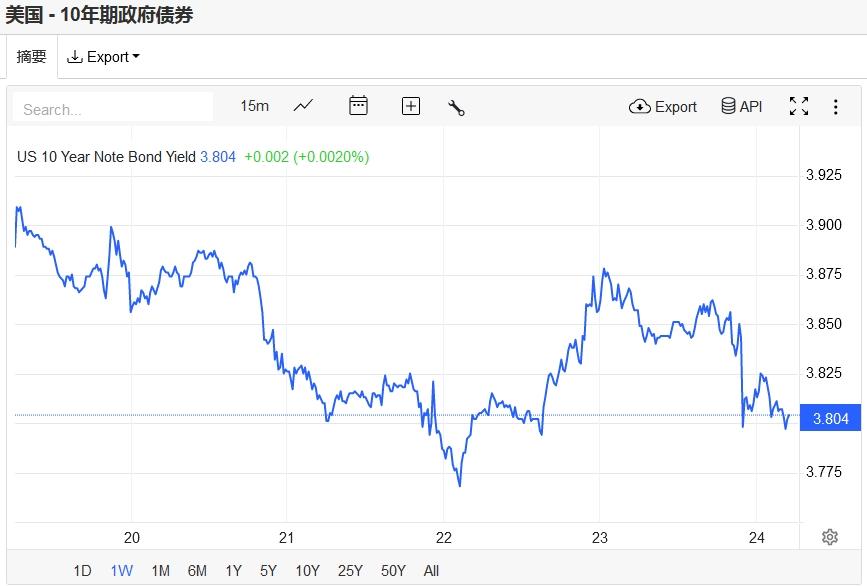 上周五,基准的10年期美债收益率收报3.8040%;对货币政策更敏感的两年期美债收益率最终收报3.1970%。