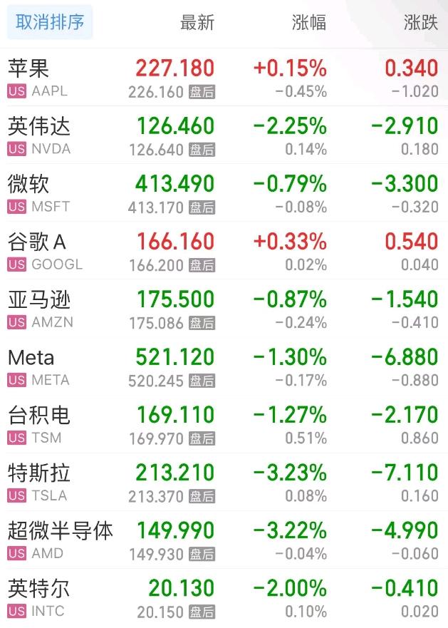 热门美股中,苹果涨0.15%,英伟达跌2.25%,微软跌0.79%,谷歌C涨0.30%,谷歌A涨0.33%,亚马逊跌0.87%,Meta跌1.30%,台积电跌1.27%,特斯拉跌3.23%,超微半导体跌3.22%。