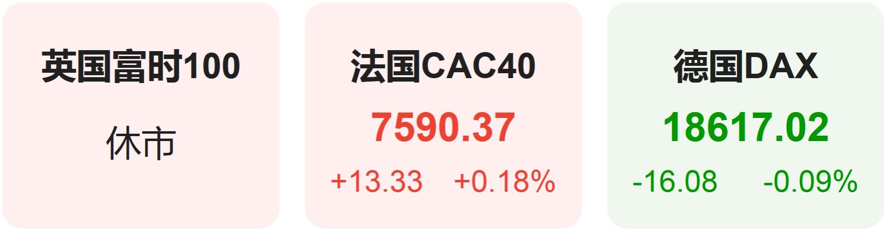 欧洲股市方面,法国CAC40指数小幅上涨0.18%,报7590点。德国DAX指数小幅下跌0.09%,报18617点。