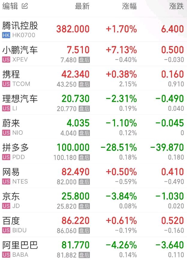 热门中概股方面,腾讯控股(港股)涨1.70%,阿里巴巴跌4.26%,拼多多跌28.51%,网易涨0.50%,百度涨0.61%,携程涨0.38%,理想汽车跌2.31%,蔚来跌1.10%,小鹏汽车涨7.13%。