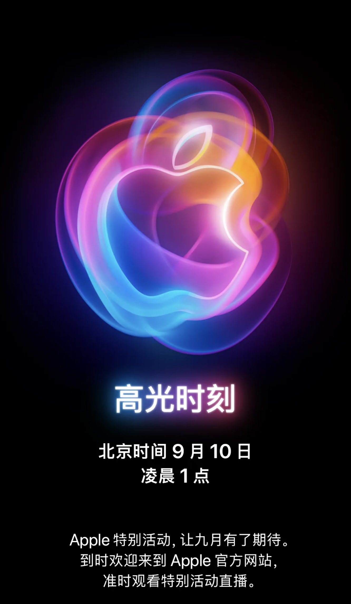 当地时间周一,苹果正式宣布,将于北京时间9月10日凌晨1点在加利福尼亚州库比蒂诺的总部举办特别活动,主题为“高光时刻(It 's Glowtime)”。此次发布会预计将推出最新款iPhone、Watch和AirPods。