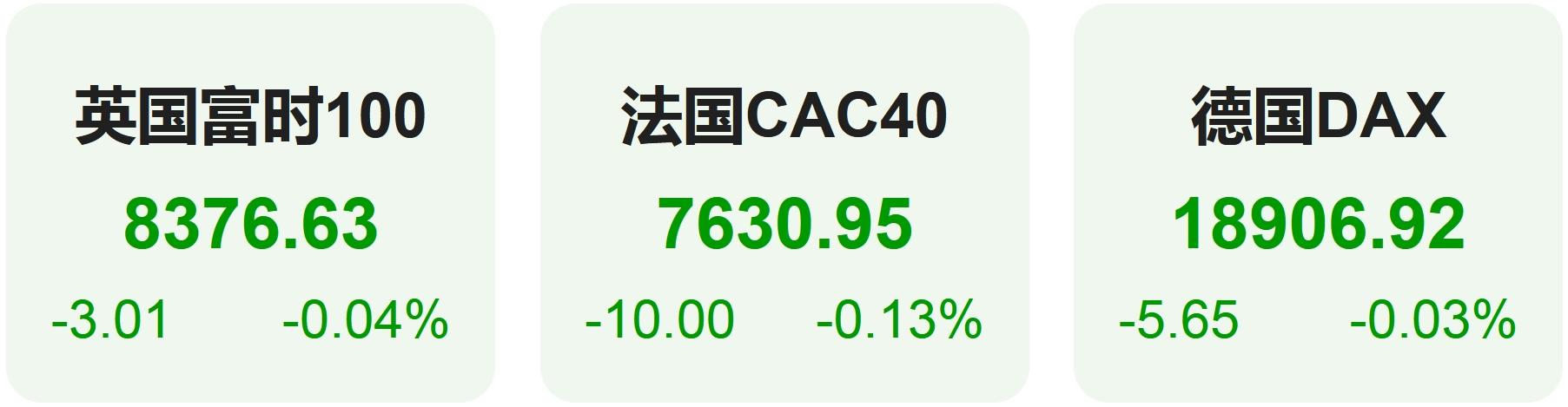 上周五,欧洲股市方面,英国富时100指数小幅下跌0.04%,报8377点。法国CAC40指数小幅下跌0.13%,报7631点。德国DAX指数小幅下跌0.03%,报18907点。