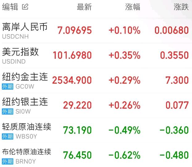 因美联储降息预期遇冷、美元指数走强和投资者获利了结影响,黄金走低,COMEX黄金收跌0.95%,报2536美元/盎司。COMEX白银收跌2.18%,报29.245美元/盎司。