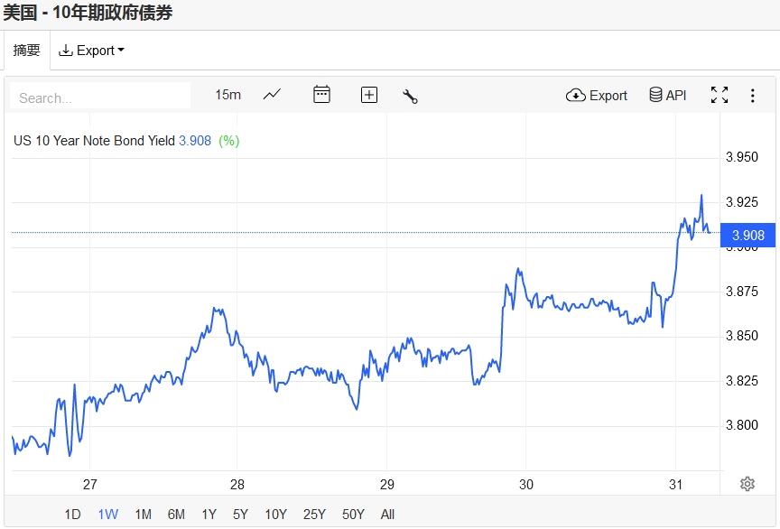 上周五,美债收益率有所攀升,基准的10年期美债收益率收报3.9080%;对货币政策更敏感的两年期美债收益率最终收报3.9230%。