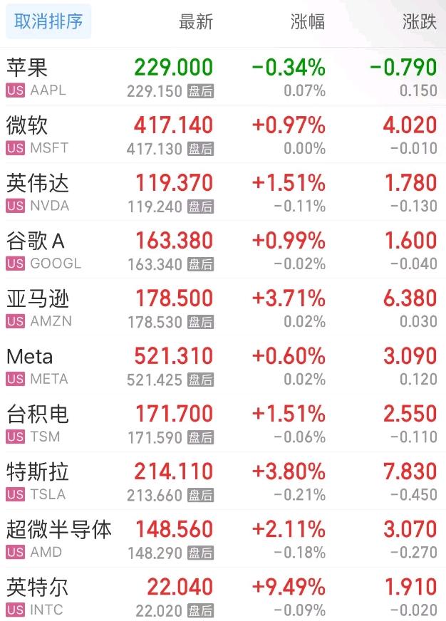 上周五,热门美股中,苹果跌0.34%,微软涨0.97%,英伟达涨1.51%,谷歌C涨1.05%,谷歌A涨0.99%,亚马逊涨3.71%,Meta涨0.60%,台积电涨1.51%,特斯拉涨3.80%,超微半导体涨2.11%。