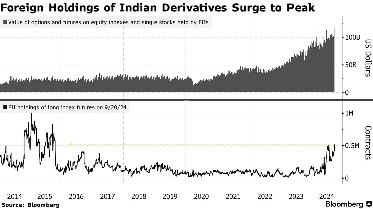 根据机构最新统计数据,截至上周五,包括股票基金在内的外国机构投资者拥有高达创纪录的9.7万亿卢比(大约1160亿美元)的锚定多个股票基准指数和单一股票的期权和期货,这些股票指数和单一股票在印度国家证券交易所上市。当天,他们将印度指数期货的看涨押注增加到高达50多万份合约,其中包括与印度股市基准——NSE Nifty50指数挂钩的期货。整体来看,外资对于印度股市衍生品的看涨配置敞口创下自2015年以来的最高统计水平。
