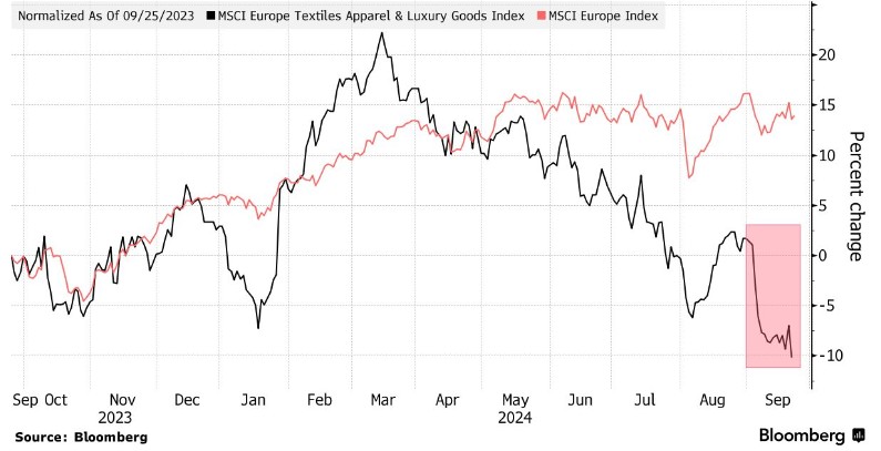 美国银行公布看跌欧洲奢侈品股的这份研报之前,另外两大华尔街大型投行高盛和杰富瑞国际(Jefferies International Ltd.)的分析团队警告称,由于全球范围的奢侈品需求依然疲软,欧洲奢侈品巨头们的利润将进一步大幅下滑。今年以来,追踪该行业股票标的的一项基准指数大幅下跌超13%,相比之下,今年以来MSCI欧洲基准股票指数则上涨7%以上。