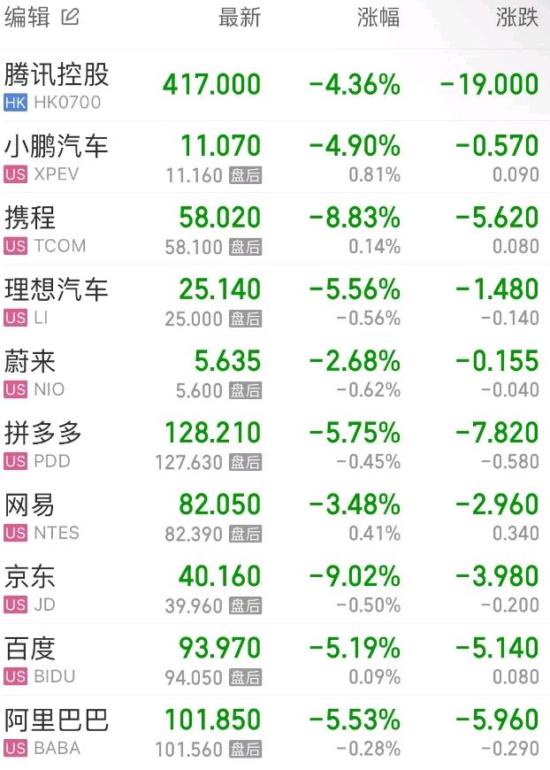 热门中概股方面,腾讯控股(港股)跌4.36%,阿里巴巴跌5.53%,拼多多跌5.75%,网易跌3.48%,携程跌8.83%,百度跌5.19%,理想汽车跌5.56%,蔚来跌2.68%,小鹏汽车跌4.90%。