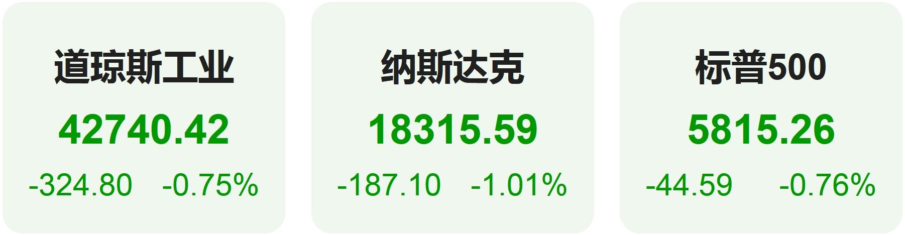 截至收盘,道指跌324.80点,跌幅为0.75%,报42740.42点;纳指跌187.10点,跌幅为1.01%,报18315.59点;标普500指数跌44.59点,跌幅为0.76%,报5815.26点。