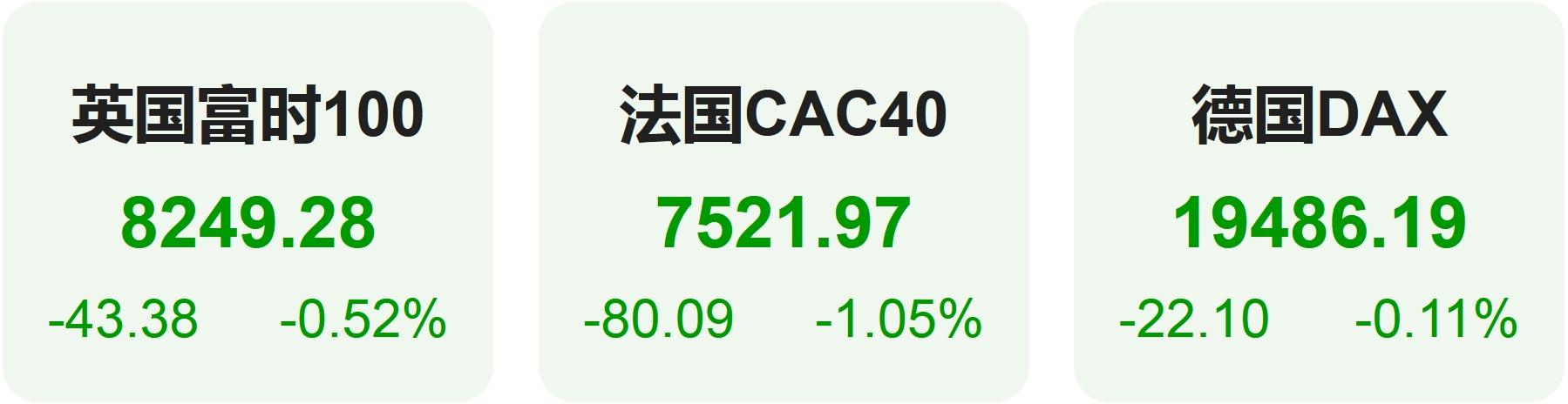 欧洲股市方面,英国富时100指数小幅下跌0.52%,报8249点。法国CAC40指数下跌1.05%,报7522点。德国DAX指数小幅下跌0.11%,报19486点。
