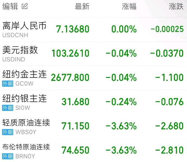 市场对伊朗供应受扰的担忧缓解且需求前景趋弱,国际油价延续大跌。WTI原油收跌3.63%,报71.15美元/桶;布伦特原油收跌3.63%,报74.65美元/桶。