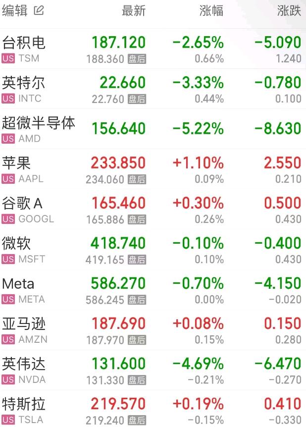 热门美股中,苹果涨1.10%,英伟达跌4.69%,微软跌0.10%,谷歌C涨0.33%,谷歌A涨0.30%,亚马逊涨0.08%,Meta跌0.70%,台积电跌2.65%,特斯拉涨0.19%,超微半导体跌5.22%。