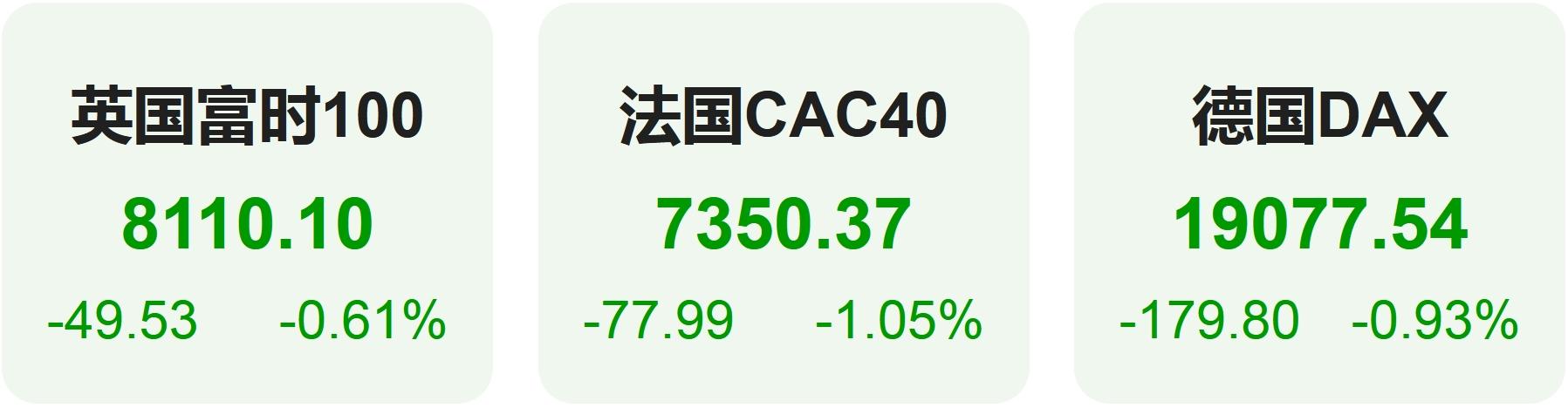 欧洲股市方面,英国富时100指数小幅下跌0.61%,报8110点。法国CAC40指数下跌1.05%,报7350点。德国DAX指数小幅下跌0.93%,报19078点。