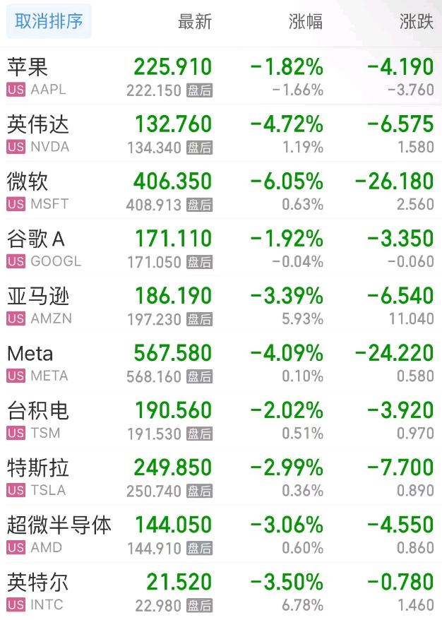 热门美股中,苹果跌1.82%,英伟达跌4.72%,微软跌6.05%,谷歌C跌1.98%,谷歌A跌1.92%,亚马逊跌3.39%,Meta跌4.09%,台积电跌2.02%,特斯拉跌2.99%,超微半导体跌3.06%。