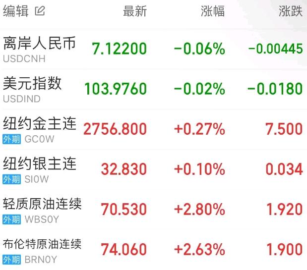因有报道称伊朗准备在未来几天从伊拉克境内对以色列发动袭击,原油延续涨势。WTI原油收涨2.8%,报70.53美元/桶;布伦特原油收涨2.63%,报74.06美元/桶。