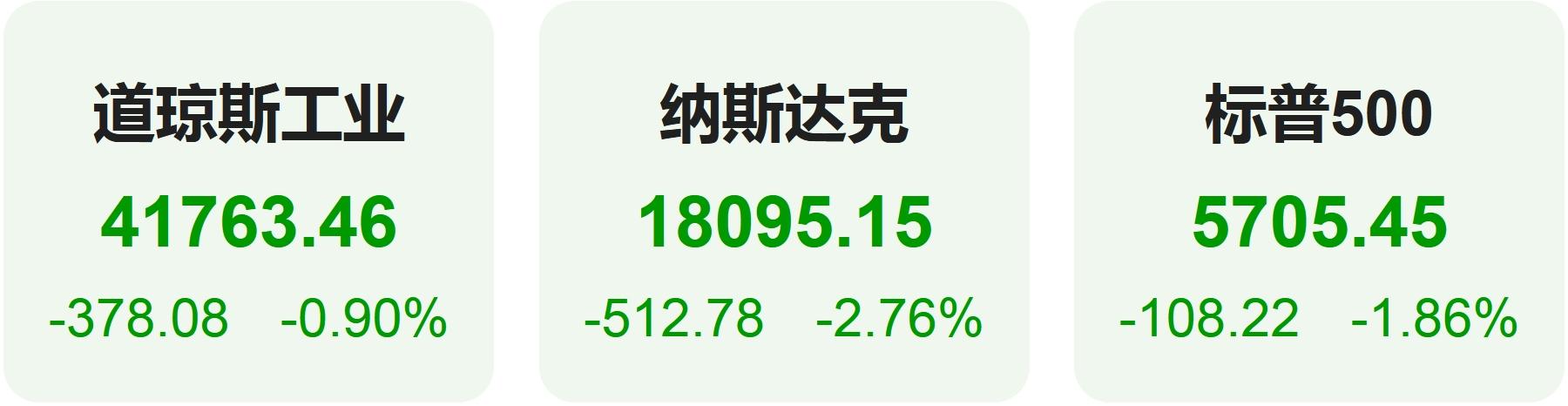 截至收盘,标普500指数跌1.86%,报5705.45点;道琼斯指数跌0.90%,报41763.46点;纳斯达克指数跌2.76%,报18095.15点。9月3日当天,标普与纳指分别下跌2.12%和3.26%。
