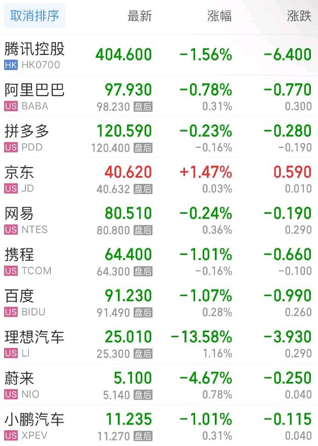 热门中概股方面,腾讯控股(港股)跌1.56%,阿里巴巴跌0.78%,拼多多跌0.23%,网易跌0.24%,携程跌1.01%,百度跌1.07%,理想汽车跌13.58%,蔚来跌4.67%,小鹏汽车跌1.01%。