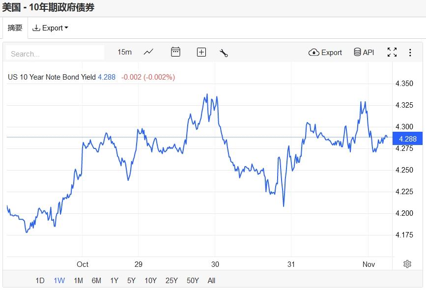 美债收益率小幅回落,基准的10年期美债收益率收报4.288%;对货币政策更敏感的两年期美债收益率收报4.170%。