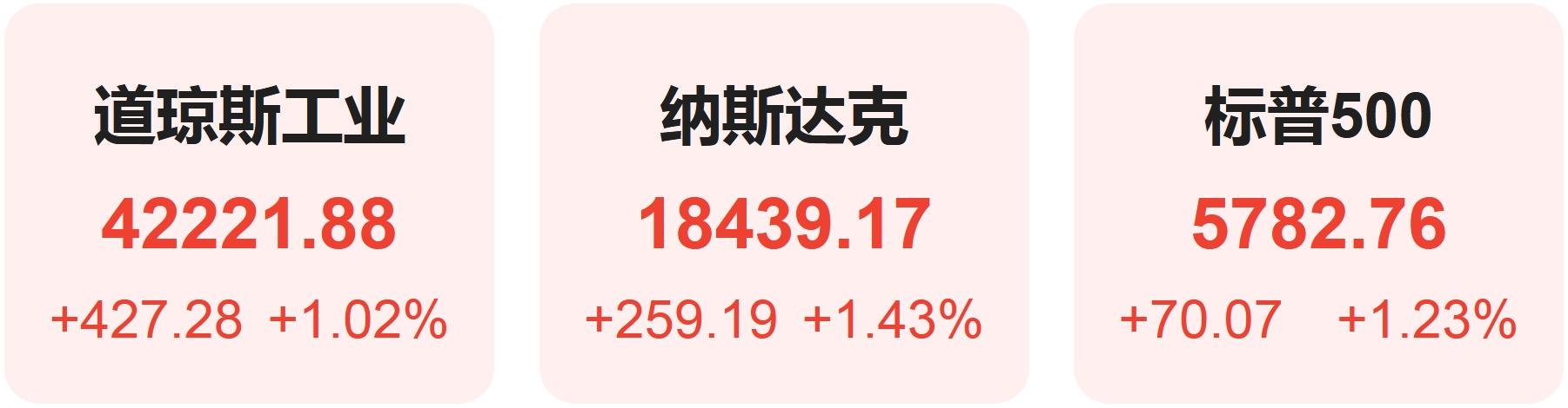 截至周二收盘,标普500指数涨1.23%,报5782.76点;纳斯达克指数涨1.43%,报18439.17点;道琼斯工业指数涨1.02%,报42221.88点。