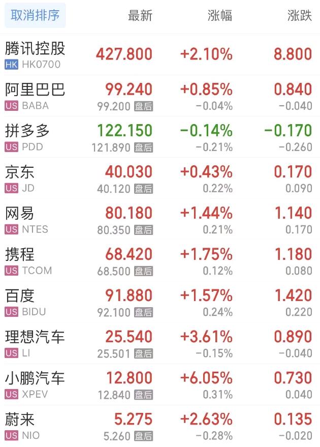 热门中概股方面,腾讯控股(港股)涨2.10%,阿里巴巴涨0.85%,拼多多跌0.14%,网易涨1.44%,携程涨1.76%,百度涨1.57%,理想汽车涨3.61%,小鹏汽车涨6.05%,蔚来涨2.63%。
