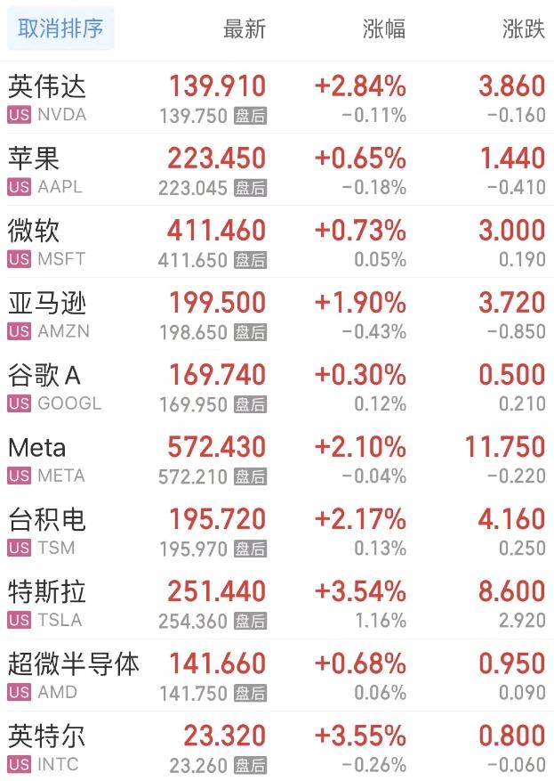 热门美股中,英伟达涨2.84%,苹果涨0.65%,微软涨0.74%,谷歌C涨0.43%,亚马逊涨1.90%,谷歌A涨0.30%,Meta涨2.10%,台积电涨2.17%,特斯拉涨3.54%,超微半导体涨0.68%,英特尔涨3.55%。