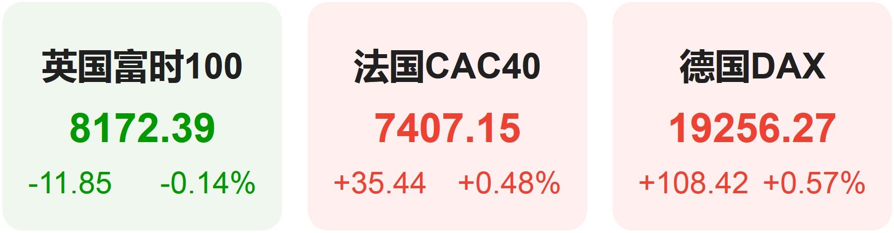 欧洲股市方面,英国富时100指数小幅下跌0.14%,报8172点。法国CAC40指数小幅上涨0.48%,报7407点。德国DAX指数小幅上涨0.57%,报19256点。