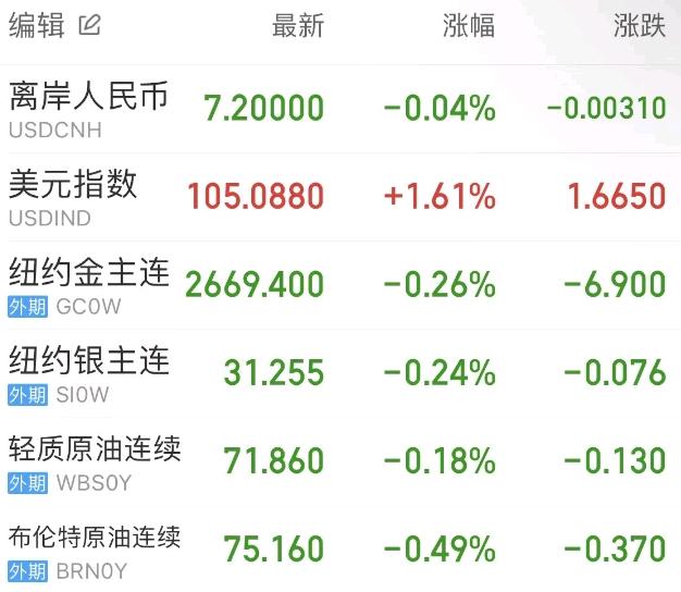 由于特朗普胜选后的移民、税收和贸易政策预计将刺激美国更高的增长和通胀,美元指数飙升至四个月新高,最终收涨1.61%,报105.088,创2020年3月以来最大单日涨幅。