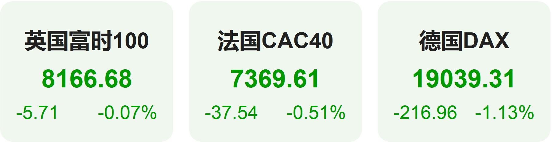 欧洲股市方面,英国富时100指数小幅下跌0.07%,报8167点。法国CAC40指数小幅下跌0.51%,报7370点。德国DAX指数下跌1.13%,报19039点。
