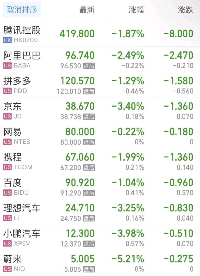 热门中概股方面,腾讯控股(港股)跌1.87%,阿里巴巴跌2.49%,拼多多跌1.29%,网易跌0.23%,携程跌1.99%,百度跌1.05%,理想汽车跌3.25%,小鹏汽车跌3.98%,蔚来跌5.21%。