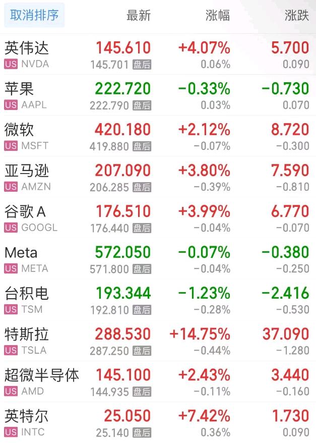 热门美股中,英伟达涨4.07%,苹果跌0.33%,微软涨2.12%,谷歌C涨4.04%,亚马逊涨3.81%,谷歌A涨3.99%,Meta跌0.07%,台积电跌1.23%,特斯拉涨14.75%,超微半导体涨2.43%,英特尔涨7.42%。