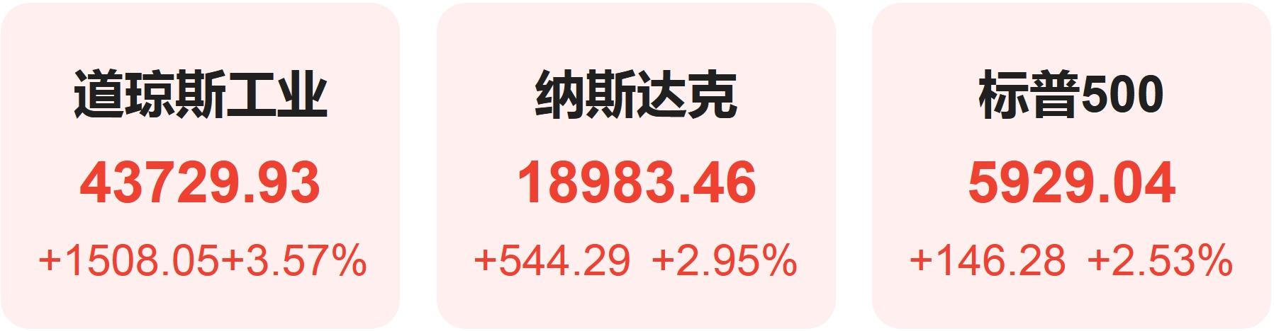 截至周三收盘,标普500指数涨146.28或2.53%,报5929.04点。根据统计,这也是该指数有史以来最好的选举日表现。纳斯达克指数涨544.29点或2.95%,报18983.47点;道琼斯工业指数涨1508.05点或3.57%,报43729.93点,均创历史新高。罗素小盘股指亦涨逾5.8%。