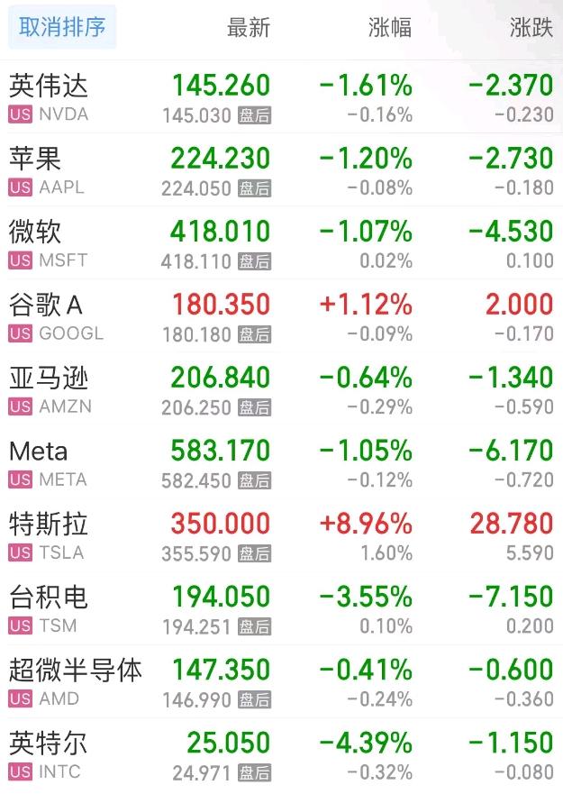 热门美股中,英伟达跌1.61%,苹果跌1.20%,微软跌1.07%,谷歌C涨1.17%,谷歌A涨1.12%,亚马逊跌0.64%,Meta跌1.05%,特斯拉涨8.96%,台积电跌3.55%,超微半导体跌0.41%,英特尔跌4.39%。