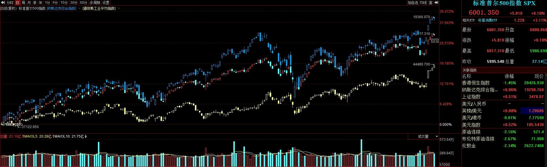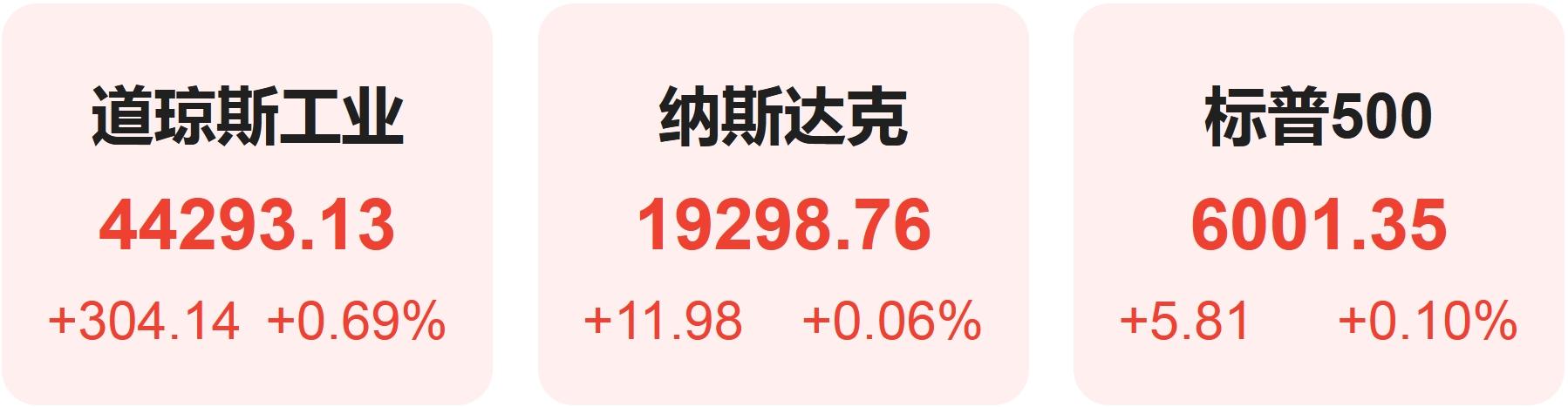 截至收盘,道指涨304.14点,涨幅为0.69%,报44293.13点;纳指涨11.99点,涨幅为0.06%,报19298.76点;标普500指数涨5.81点,涨幅为0.10%,报6001.35点。罗素2000种小盘股指数涨36.93点,涨幅为1.54%,报2436.57点。