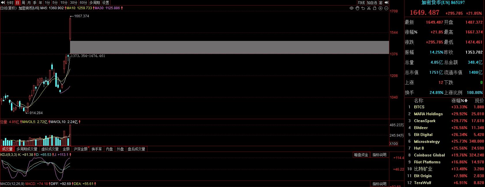 加密货币概念股大涨,嘉楠科技涨41%,MicroStrategy涨25%,Coinbase涨19%。比特币站上87000美元/枚,日内涨逾6600美元,续刷历史新高。